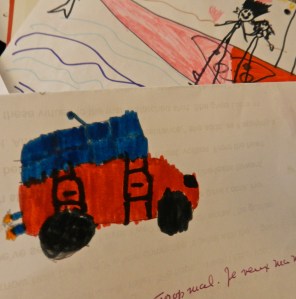 Sorting through old papiers, I come across the drawing by a little boy whose stomach hurt too too much. He was crying from the pain and asking for his mother. I had asked him to draw his stomach ache. He had drawn a car. I had asked: “What does your father do?” and the little boy had answered: “He buys cars, he sells cars, he buys cars, he sells cars…” Given the daddy had recently gone back to jail, I had inferred from this the last sale hadn’t gone too well.