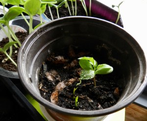 Illustration: parmi les semis tout à leur tâche de croissance en ce moment, ceux-ci sont les plus étonnants: dans une pomme (très) savoureuse, certains des pépins avaient commencé à se transformer en pommiers. (Où vais-je les planter? Dans le bout de parc devant chez moi.)
