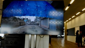 Illustration: while reporting from one of the towns under curfew, Zehra recorded this short clip. To the sound of constant gunfire, you see the blue curtain rise across the street, pushed by the wind, revealing the destruction beyond. The video was part of the installation at the Tate Exchange between May 21st and 25th.