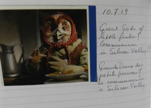 Illustration: J’ai découpé l’image de cette marionnette-hibou dans une revue parce qu’elle me plaisait bien, sans songer à noter les détails sur sa création. Si quelqu’un a cette information, prière de la fournir que je puisse ‘rendre à César’ ce qui lui appartient.