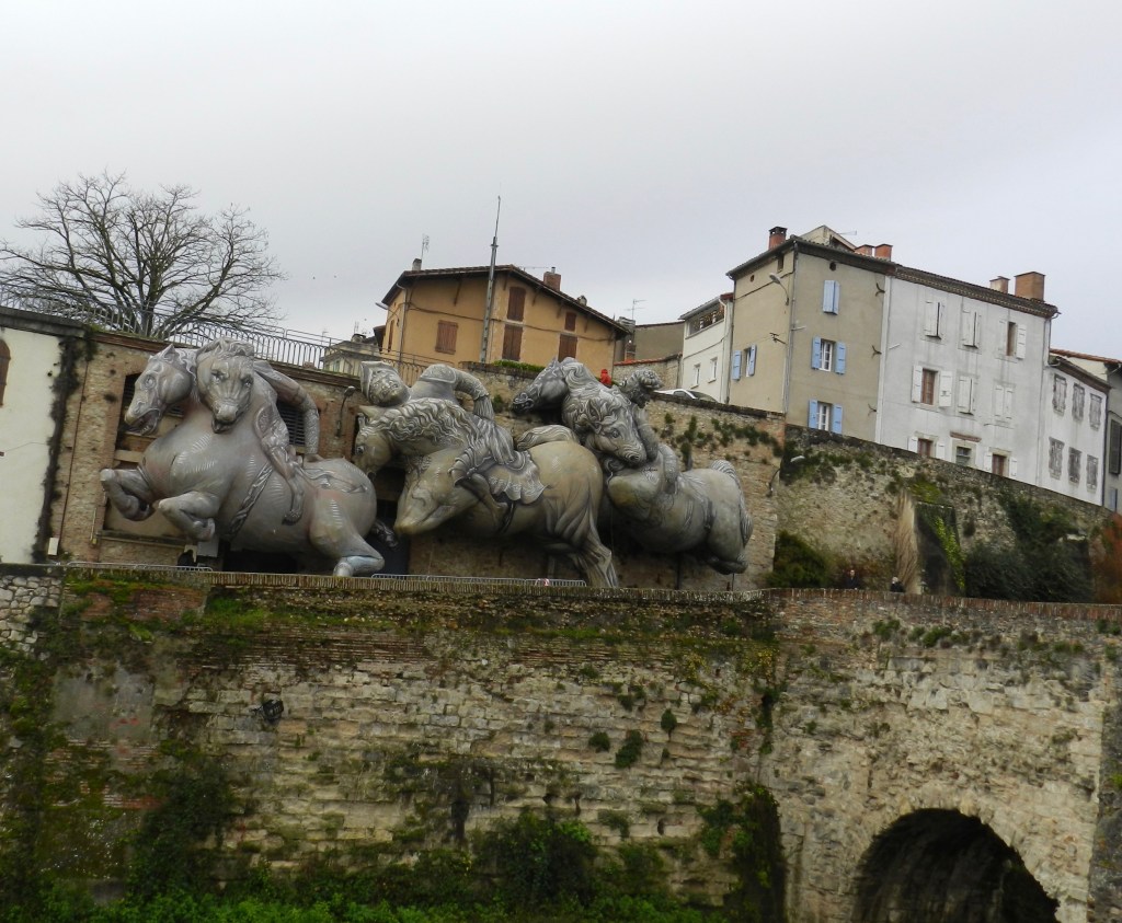 En “temps normal”, les chevaux de la bataille d’Anghiari, vus et revus par les Plasticiens volants ne cavalent pas devant le pont vieux de la ville. Mais voilà: tout comme les autres artistes (dans cette ville et ailleurs), les Plasticiens ne tournent pas en ce moment de grand vide culturel. Alors, ce week-end, ils ont fait profiter les habitants de la ville d’une dizaine de leurs créations, question de ranimer pour un temps ces lieux de passage qu’on nomme “rues” où, normalement, on se croise et décroise, échangeant les dernières nouvelles et, surtout, les potins les plus récents…
