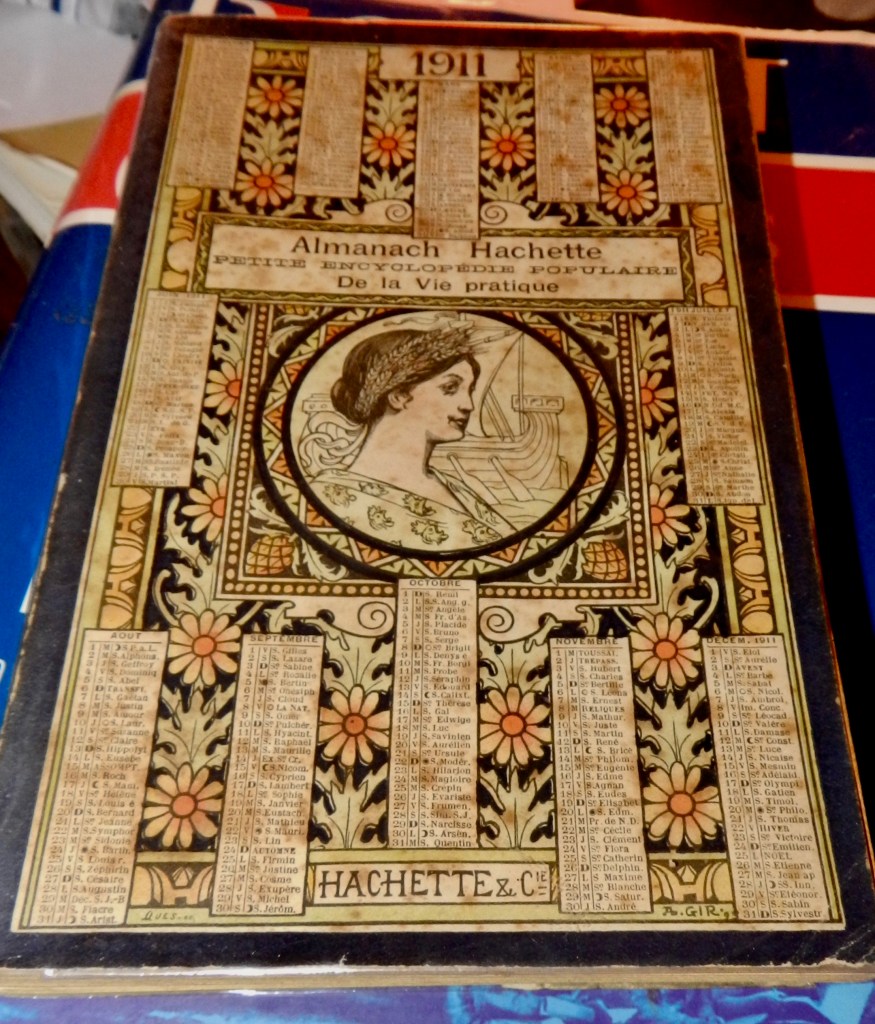 Last night before going to sleep, I leafed through the 1911 Almanach Hachette. Among the undecipherable rebus in their Great Rebus Contest, I found under Practical Recipes for Daily Life some neat instructions for making writing inks in four different colors (black, blue, green and red.) In these strange times, who knows when this might prove useful. Besides which, this made me laugh a bit because I had just found a short story I wrote in 2013 in which the character walks around with 4 of those ballpoint pens that you can click to write in one of 4 colors – black, blue, green and red.