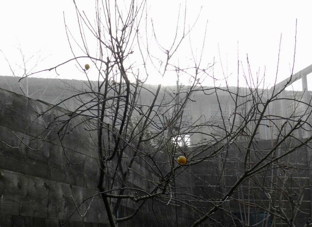Meanwhile, I can well understand if you can’t see all the interest generated by those two apples still hanging on their branches ( they, in their unrotten state). As soon as I appear, the volley of birds takes off and seeks refuge on my neighbor’s persimmon tree where a few persimmons cause the same kind of assembly – blackbirds, mainly, although much smaller birds also find their way to a peck or two. For an animal equipped with a beak, the eating of an apple (or of a persimmon) doesn’t involve large or small gulps. Reason for which these fruits have been part of the daily food supply for a good fifteen or so birds in the past few weeks. They all seem to be pulling through quite well without any State telling them what to do or how to do it. As Vinciane Despret writes in Habiter en oiseau, for birds, it’s all about territory, not Statehood: “Setting up a territory means creating modes of attention.” Birds are attentive to one another. Fights leading to wounds or death are rarities.
