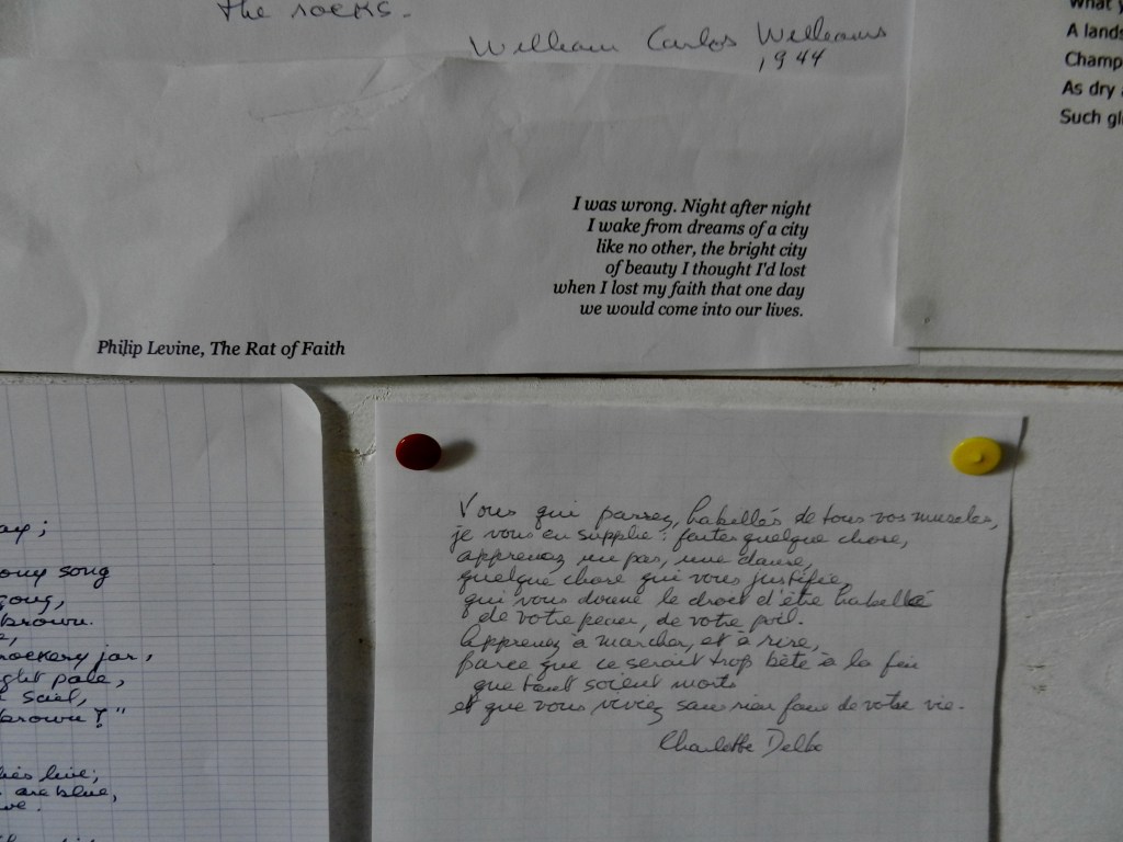 Alors oui, besoin vital de beauté. Rappel des mots de ces deux voix sur le mur de ma chambre: le poète Philip Levine et Charlotte Delbo.
