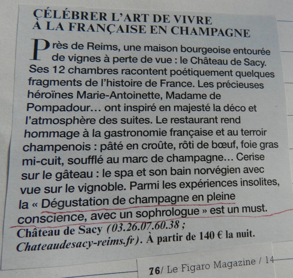 champagne et sophrologie : il s’agit de l’une des nombreuses suggestions de vacances que j’ai découpées dans une copie du Figaro Magazine laissée à la clinique par un patient. Vous pourriez aussi “célébrer l’art de vivre à la française” en allant pêcher à la mouche en Normandie (attention ! “pas question de tuer les poissons, on les remet à l’eau dès qu’ils ont mordu l’hameçon. À partir de 290€ la nuit et la journée de pêche – matériel fourni.”) (Est-ce qu’on baptise la petite bête avant de la relâcher, avec une injonction à ne plus pécher ?)