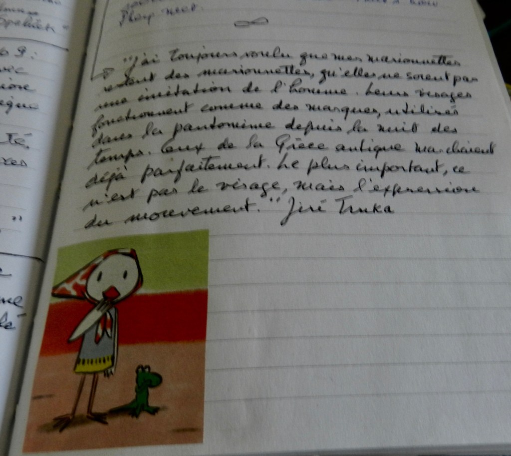 Illustration : c’est bien peu de choses mais j’aime bien la citation du marionnettiste Jirii Trnka : ” J’ai toujours voulu que mes marionnettes restent des marionnettes, qu’elles ne soient pas une imitation de l’homme. Leurs visages fonctionnent comme des masques, utilisés dans la pantomime depuis la nuit des temps. Ceux de la Grèce antique marchaient déjà parfaitement. Le plus important, ce n’est pas le visage, mais l’expression du mouvement.”
