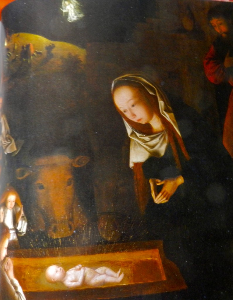(Parlant d’instinct de conservation, je me permets de recommander une légère couverture pour le nouveau-né dans l’illustration ci-haut ? Le souffle du boeuf est sans doute chaud sur le coup, mais il est bien humide, itou.)