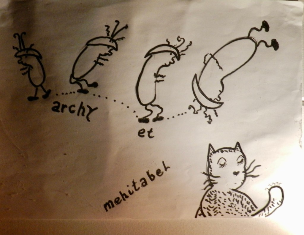 (Illustration: yes, you may well wonder what archy the cockroach and mehitabel the alley cat (I draw very poorly) have to do in this matter of Wigglies. Well, know that the papers also tell us that there is now proof of the existence of a millipede with literally one thousand little feet, and that archy once wrote a poem about one such (female) millipede leading a (male) spider astray from his conjugal duties. (It’s a very sad poem. I’ll get back to it on another day perhaps.)