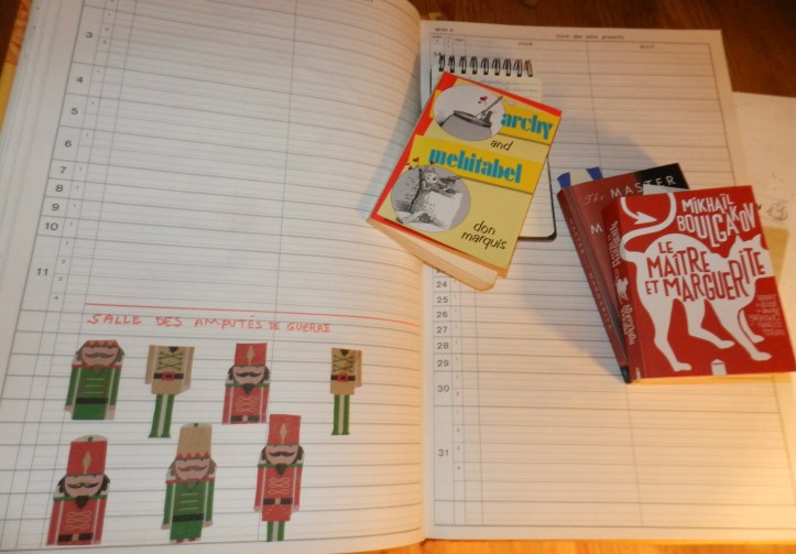 As for me, I’ve pulled out the Great Book of Prescribed Treatments from under a pile of books. I found it initially in the back room in an old house in Capestang. Since then, it has served as a massive notebook for personal thoughts, my own, and those of the kids who have passed through my life. A “hiding place” that isn’t one, the most physically impressive of the “notebooks” in which I jot down a mix of nonsense, of beginnings to short stories, and various scribblings. Since yesterday, it took on fresh duties as inner playground with the arrival of the room of war amputees.