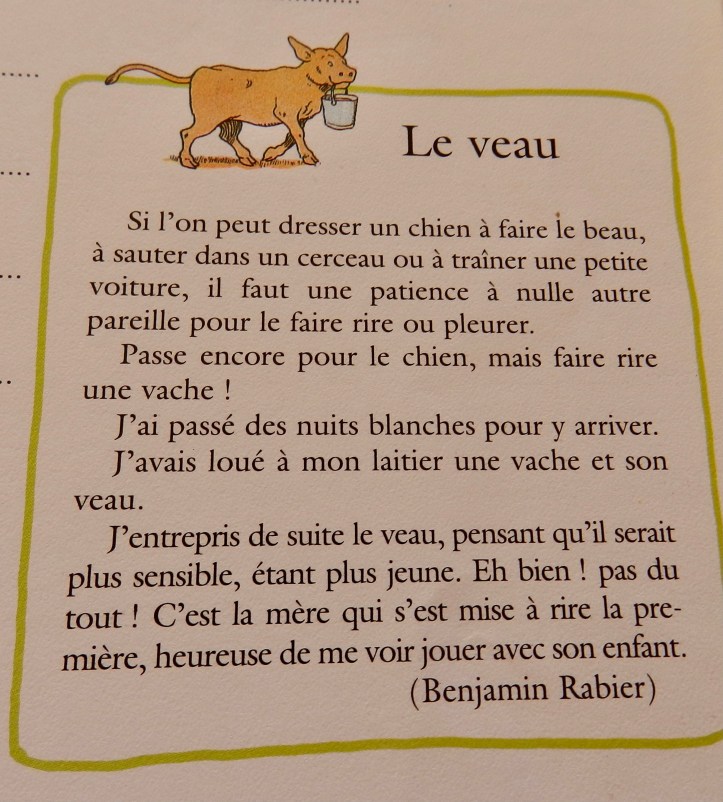 Le veau illustré ci-haut maintenant. C’est vrai, il est anonyme et nul n’a raconté sa fin ultime. Sa maman, elle, est la star des créations de Benjamin Rabier. Elle est bien plus connue que son créateur, en fait, puisqu’elle est la seule, l’unique, l’incomparable Vache qui rit , ce must des pique-niques conviviaux (et des plateaux-repas dans une clinique médicale dont je ne dévoilerai pas le nom pour lui éviter des foules de malades réclamant leur admission.) Durant mon séjour de dix jours à la dite clinique, j’ai conservé dans mon carnet de notes les petits collants de la vache en question, avec ses commentaires. Pas de quoi casser des briques, mais un bon moyen de me distraire quand je m’auto-ligotais dans tous les fils me reliant aux diverses machines.