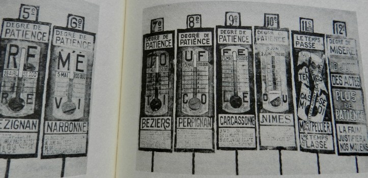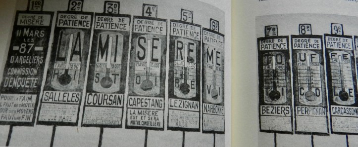 Pourquoi les 12 pancartes des femmes des Halles de Narbonne, lors de la manif du 9 jin 1907 à Montpellier ? Parce qu’une ancêtre d’un de mes personnages en était de cette manif, et elle a transmis à ses descendants une copie de la publication originale du journaliste Jean Fournel, Avec Ceux d’Argeliers paru en 1908 aux Editions languedociennes à Montpellier. (Dans mon cas, l’illustration est tirée de la ré-edition de l’original en 2014 aux Editions Christian Salès.)
