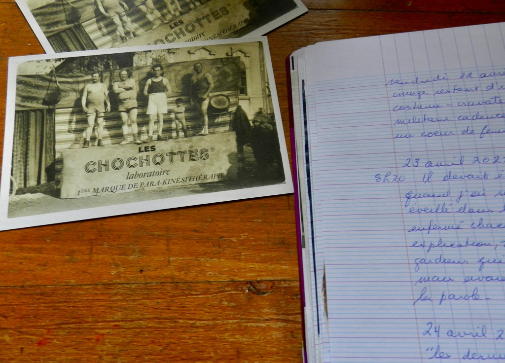 Illustration: Les chochottes? One might think this is one of the modified poscards from Plonk & Replonk. But no. I picked these up at my pharmacy. On the reverse side, you learn that this is the “1st brand in para-kinesiotherapy”. Note that all these gentlemen are “in the image of God” which does nothing to simplify my comprehension of theology (and may the good lord help the little tyke on the podium aspiring to the same likeness).