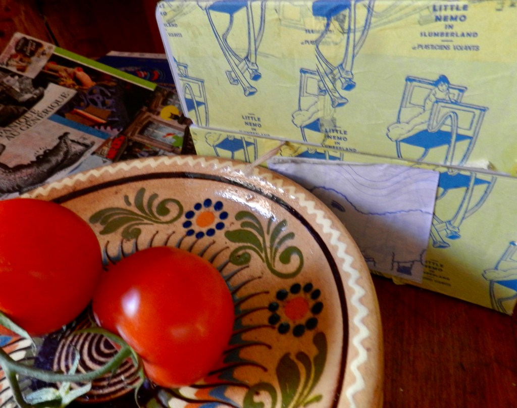 Une habitude : dans la boîte en arrière-plan de l’image, je conserve les carnets qui m’accompagnent au jour le jour. Un coup d’oeil de temps en temps et j’y retrouve le mélange de numéros de téléphone importants à l’époque, d’événements, de livres à commander, de réflexions ou de bouts de dialogue que je veux placer dans un récit, de pensées éparses, en français, en anglais et parfois, dans une langue qui bifurque de l’une à l’autre à mi-chemin.