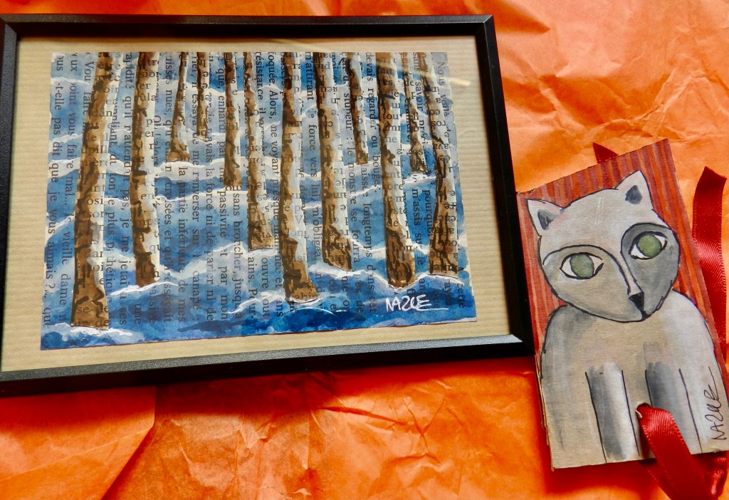 Ma copine de Kedistan m’a envoyé le petit tableau et le marque-page sur bout de carton, illustrés ci-haut. Vu de plus près, je constate que chaque arbre a été découpé dans une page autre que celle sur le fond et comme quelqu’un me fait gentiment cadeau de livres décrits comme des “heartwarming sagas” les livres en question ont peut-être un nouvel avenir devant eux… Le dernier que j’ai reçu contenait comme marque-page un morceau d’emballage de chocolat noir de qualité…Je l’ai feuilleté rapidement; c’est un genre spécifique de livres destinés aux femmes qui nourrissent leur solitude le soir, en lisant et en mangeant du chocolat; les histoires sont toujours inspirées du modèle de base de Cendrillon, ou Blanche-Neige, il y a toujours une vilaine femme d’une jalousie maladive qui ne veut que du mal à l’aimable, gentille, douce et tendre héroïne et Le Bien (l’Amour d’un homme Juste et Bon) l’emporte toujours dans les trois derniers paragraphes. J’éprouve un certain respect pour les femmes qui ont la persévérance requise pour tricoter encore un autre récit à partir d’un modèle aussi éculé. Je vois que ce livre-ci est le quatorzième dans la série des Jenny, Candace, Heather, et autres rescapées par l’amour. J’imagine sans difficulté que les treize autres se terminent aussi au moment du coutumier ” ils vécurent heureux et eurent beaucoup d’enfants.”