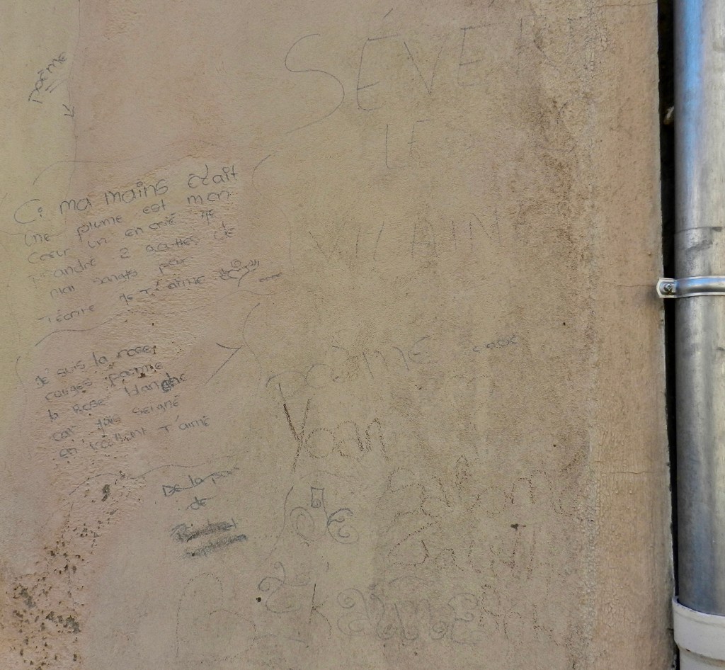 Out of courtesy, I read a bit but it’s such a compendium of implausibilities that I leave the characters to their unhappy fate at the hands of an author who must have been complimented for his talent with comparisons and metaphors, considering the following gobbledygook: “Birds were still singing in the trees that stood across the major surgery of sunset like massed artery forceps.” I’d be hard pressed to say if the forceps refer to the trees, to the birds or perhaps to stray crimson clouds lit up by the setting sun. Moreover, the author uses the old trick of unnecessary inventories to stretch the gravy – lists of furniture, knick-knacks, clothes in the closet etc. In short, the pages will serve as background for collages and the ‘opus’ inspired the use of the illustration above – even if the wall scribblers have a form of sincerity going for them.