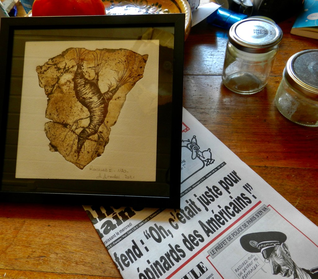 Anna Amodei est sage-femme. Elle est aussi artiste-graveure et utilise des vestiges métalliques trouvés dans la nature pour réaliser ses oeuvres à la taille-douce. Au premier regard, j’ai confondu la forme de la racine de ginseng avec celle d’un oiseau aquatique plongeant pour sa nourriture.