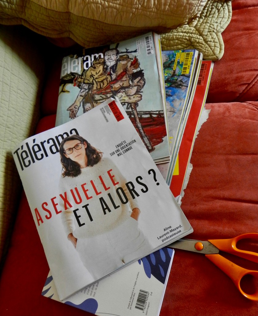 In the pile of old Téléramas brought over by a friend to read and to cut up I come across the one illustrated above, dated 9 to 15 April 2022. Apparently, and as a great priority, in the parade of labels you can stick on your forehead, there is now the possibility of declaring yourself “asexual” – to varying degrees, according to what I understood of the article.