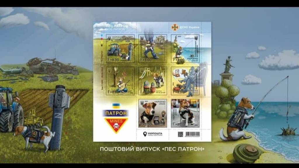 (timbres émis par le service des postes d’Ukraine, en hommage au chien Patron, héros national des équipes de déminage / postal stamps produced by the Ukrainian postal services, honoring Patron, the national hero of the de-mining teams)