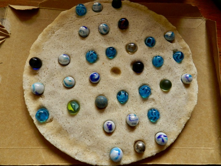 That said, writing-wise, I spent the morning with little Nico, with a quick back and forth to the market for bread. It’s a rather amusing moment because his favorite book (non-existent in reality) is starting to intrigue me as much as it is cherished by this almost-but-not-quite ten year old. I can even see the cover illustration in various shades of the blue of a blue- moonlit night. (Yes, all the blues in the marbles in the illustration above.)
