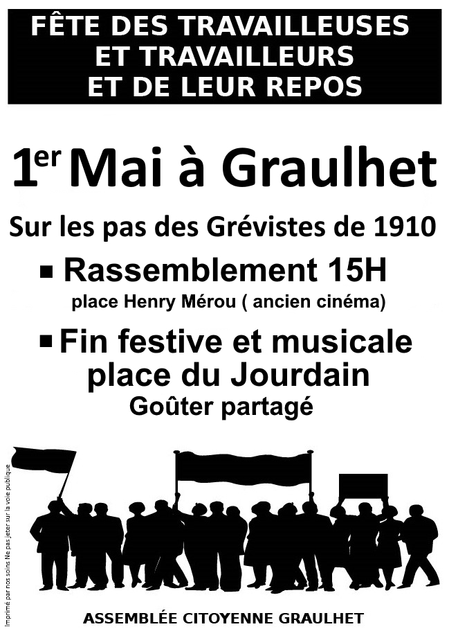 Préparation de la marche du 1er mai “dans les pas des grévistes de 1910” dans cette ville-ci. Contenu des tracts et des affiches, impression, distribution, contenu et préparation des banderoles, discussion avec la gendarmerie qui voudrait bien faire passer le cortège par des petites rues anonymes – alors qu’un 1er mai, jour férié, la circulation des voitures ne sera nullement entravée (de toutes façons, la météo s’annonce pluvieuse et nous ne serons pas des milles et des cents. Pour ce qui est de la “fin festive et musicale, elle risque plutôt de ressembler à une débandade sous l’orage. Pas grave. C’est une première. On verra pour la suite. )