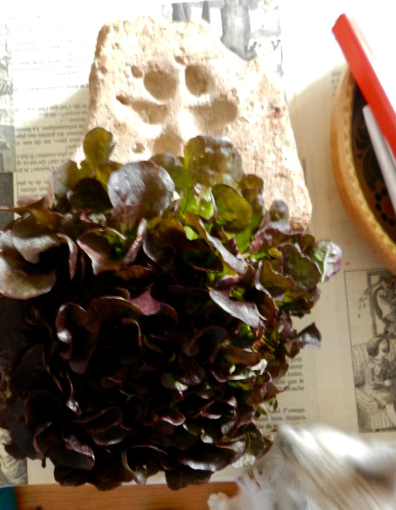 The lettuce shown above represents the highlight on Friday, May 12th, a day devoted mainly to sleepiness, coughing and nausea, when at 3:54 PM, a young activist from the organic food movement knocked on my door and gave me this magnificent result from a session of culling in his vegetable patch. I thanked him, took a photo, uploaded it. And prepared a herbal tea (verbena) after such an expenditure of energy. I spare an eventual visitor to this blog the narration of the rest of the day’s exciting events. Today will probably turn into a facsimile.
