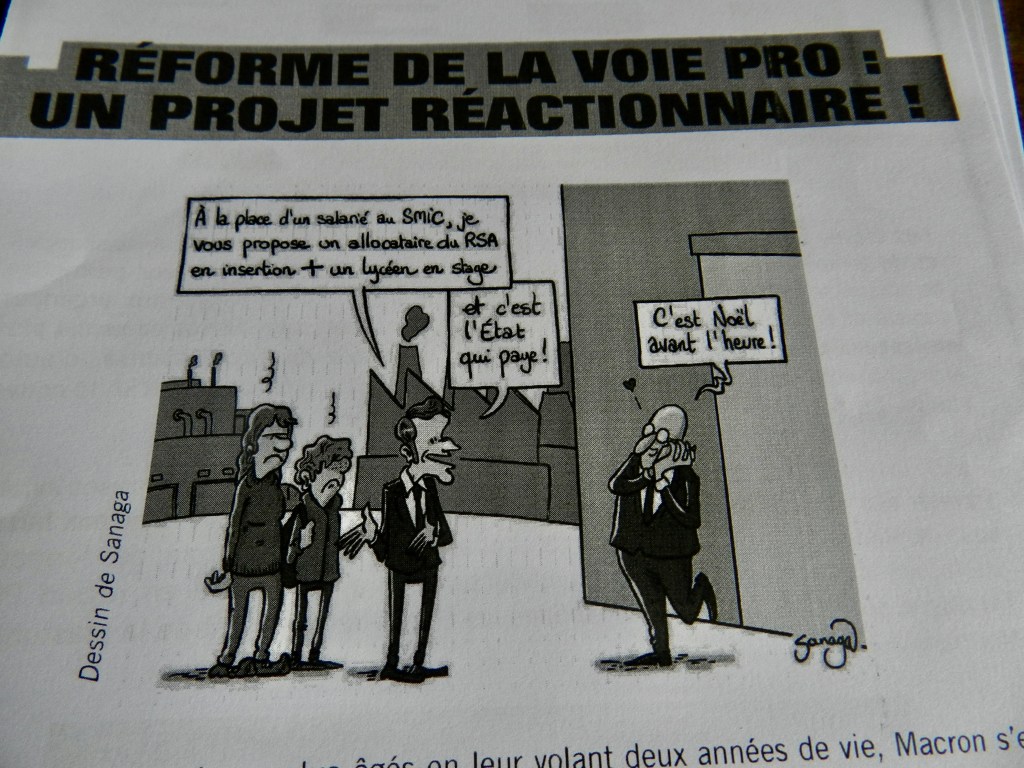 Et en voie de le devenir encore davantage : On toque à ma porte. C’est mon voisin, celui qui se décrit lui-même comme un “vulgaire saltimbanque aux yeux des braves gens”. Il arrive du lycée professionnel local devant lequel les. profs manifestent contre la nième réforme du bac professionnel, celle-ci réduisant encore davantage le temps consacré aux apprentissages scolaires, pour livrer les lycéens pour un nombre accru d’heures en tant “qu’apprentis” aux entreprises locales, en fonction des “besoins” de celles-ci. Dit tout crûment: on s’apprête à réduire encore davantage les possibilités d’émancipation de ces jeunes, et à assigner les profs ainsi “libérés” à des postes vacants à d’autres niveaux de la “structure” pédagogique.