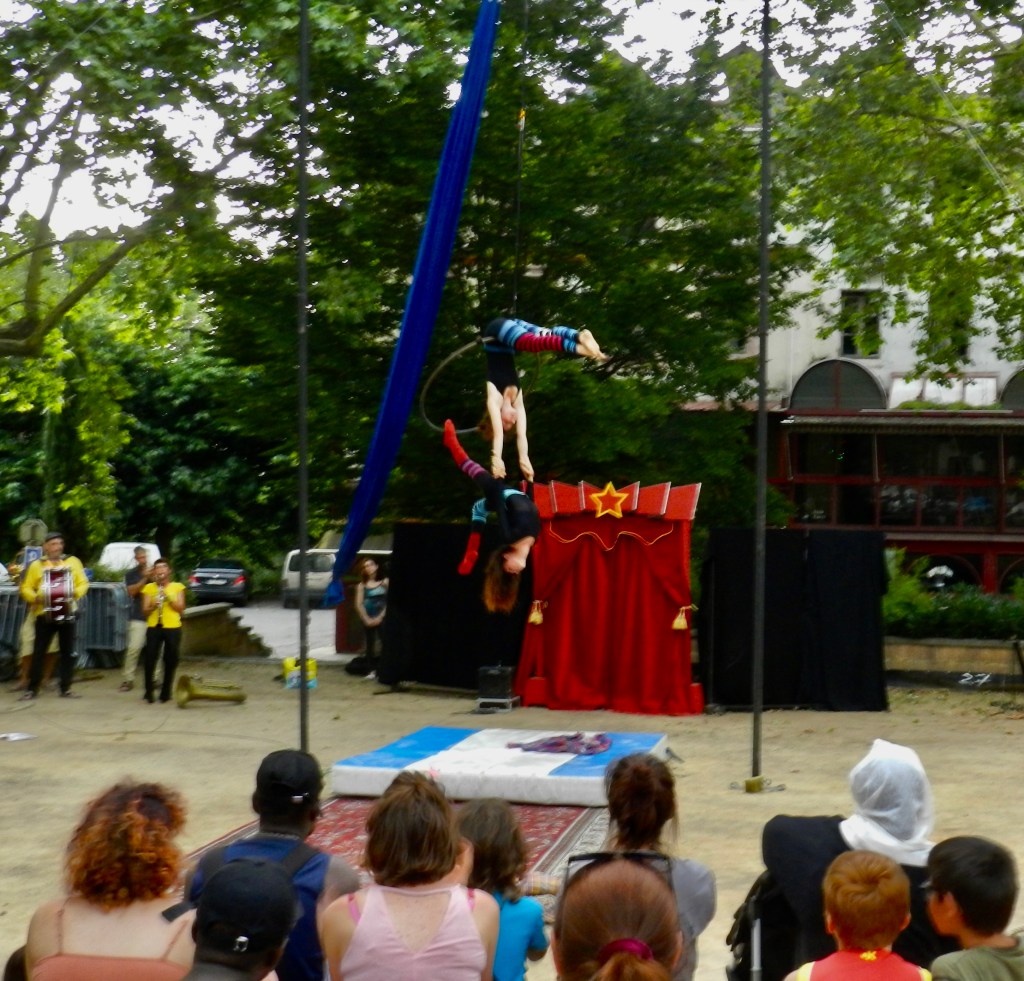 Tents, trucks and camping cars cover every available space: the people of street performances are here until tomorrow morning. The people from the off performances who live off the proceeds from the hat passed around – spare some change, ladies and gents? – and a certificate by the festival organizers insuring their status as intermittents du spectacle (occasional show business workers). Whereas those performing on the in also receive a modest stipend paid out from the (also modest) subsidies.