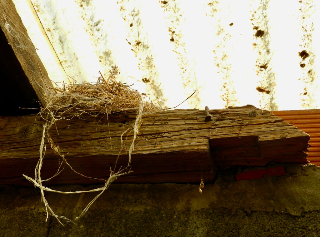 Au printemps, un merle avait presque terminé ce nid dans l’appenti lorsqu’elle l’abandonna, effarouchée par l’ombre d’un chat traversant la toiture en plastique ondulé. Un petit oiseau l’a recupéré et y a élevé sa nichée, une partie de laquelle s’épivarde dans le jardin. J’ai bien fait de ne pas prendre un chat.