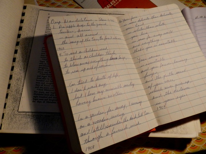 Writing workshop this afternoon. I don’t really feel an overwhelming hunger for it. Deep into the land surveyor’s notebook where I noted English translations of poems by Mandelstam, between 1980 and 1982, in Tel Aviv and on trips down to the construction sites in the desert. When I finally began to drift off to sleep, for a brief moment, I was no longer in my apartment over here, but back on Sokolov Street in Tel Aviv; it took a moment as I re-emerged from almost-asleep, to find myself here again, now.