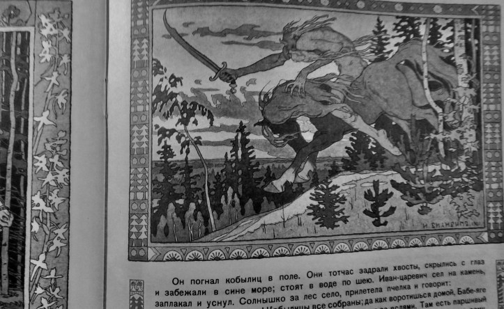 Le parallèle est fort valable, en effet, parce que pour ce qui est de comprendre l’actualité… Pour ce qui est de cette illustration, il s’agit de Kochtei dit l’Immortel ou le Sans Mort, lancé à la poursuite des amoureux dans le conte Maria Morevna. (Il perdra, et c’est ce qu’on peut souhaiter de mieux aussi, pour le monde en-dehors des contes.)
