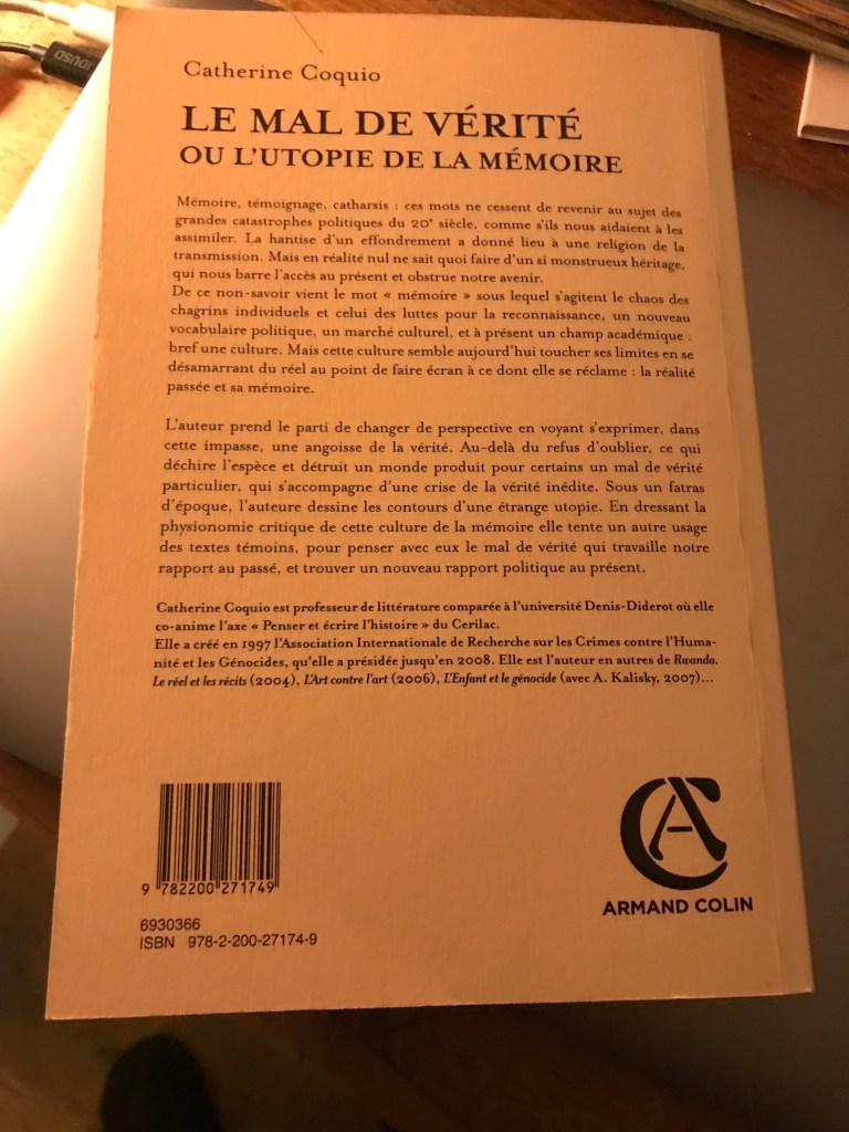 Two topics occupied my thoughts yesterday: algorithms (I’ll get back to them) and the content of the book illustrated above which I read in 2015 or 2016 (and heavily annotated, as I usually do). Including these words underlined on page 131: “Qu’en est-il des “retrouvailles” après les grands maux sans remède de l’histoire du XXe siècle ? Quand la mémoire devient le matériau d’une nouvelle société du spectacle, quelle chance a la réalité d’arriver jusqu’à “nous” et de quel “nous” peut-il s’agir ?” (Where do things stand concerning the “reunions” following the great unremedied ills of the Twentieth Century? When memory become the material of a new society given over to spectacles, what chance is there for reality to reach “us” and of which “us” can there that be?” A reflection to which I add: what can be expected when the “duty of remembrance” morphs from a throbbing personal search for a truth that eludes us, transformed into a political and administrative injunction and the poster images confrontations between the “victim identities” tearing at each other in variations on past horrors, now revisited and reactivated ?