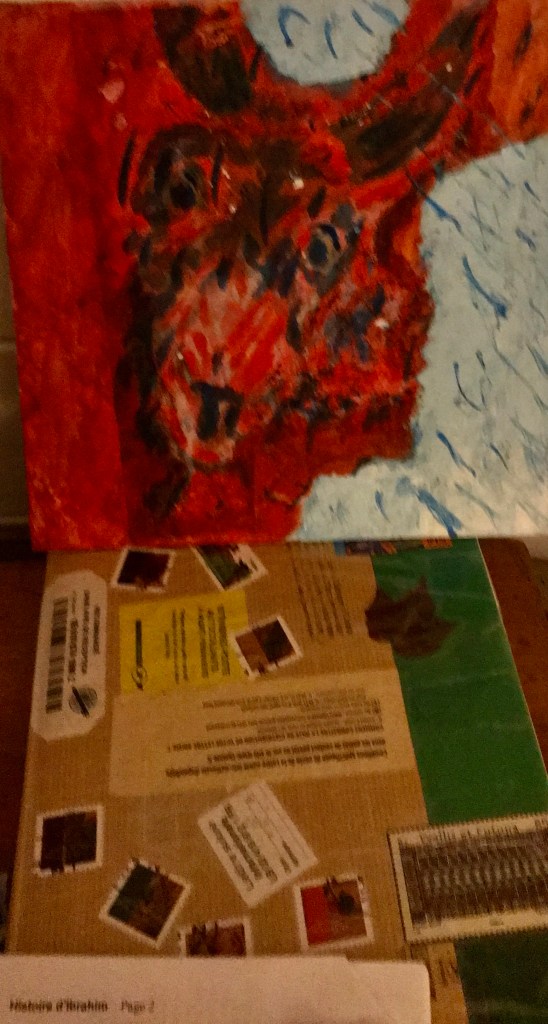 (Et le titre sous l’illustration : hier soir, à l’Artonef, il y a une des participantes à l’atelier qui trouve tout ce que je dis très drôle et pendant que je peignais les yeux de l’ânon ci-dessus, je lui parlais (à l’ânon) en lui posant des questions comme : “tu veux nous dire quelque chose ?”; cette personne se convulsait de rire en me disant: “tu pourrais l’intituler “conversation avec l’âne”; en effet, lui ai-je répondu. C’est donc le titre du tableau.)