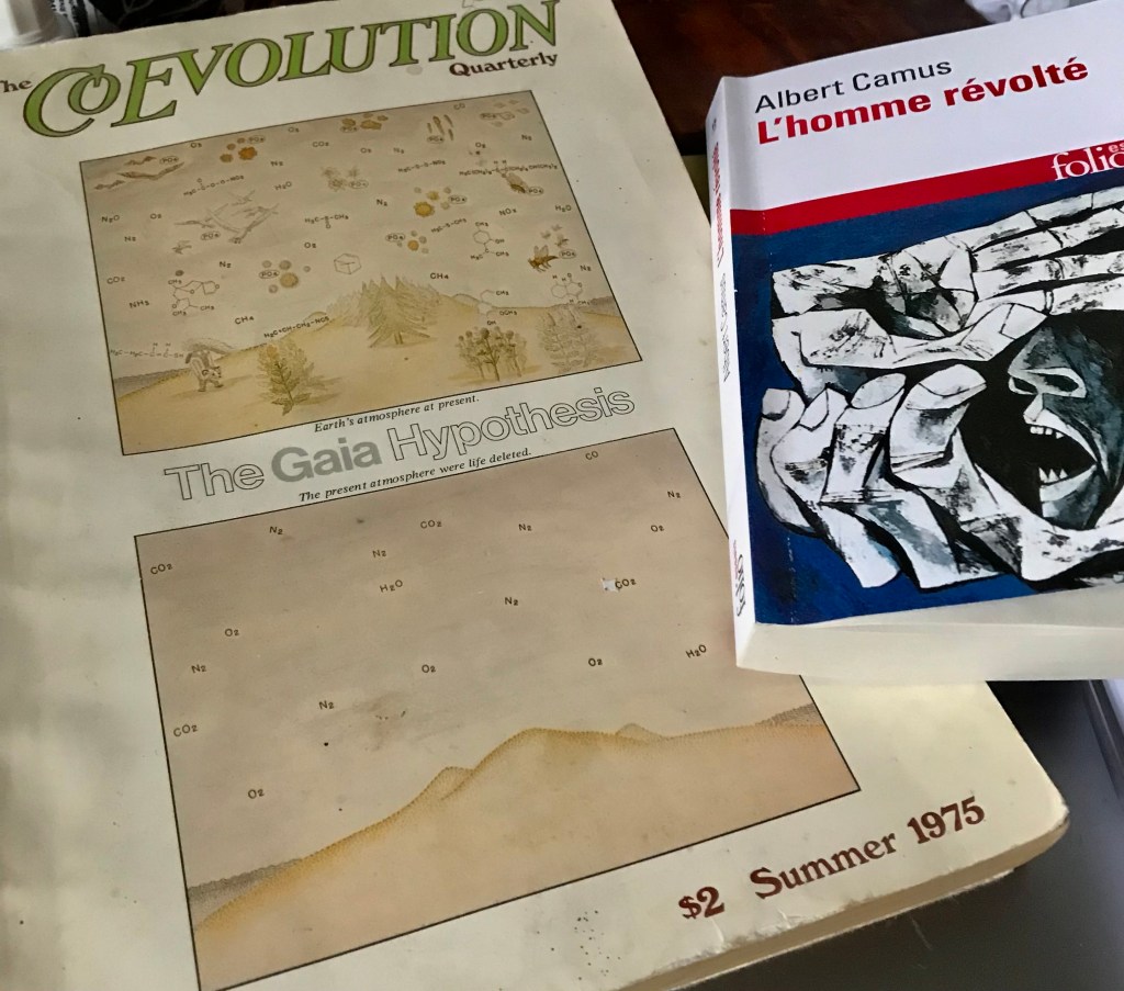 These dreams are something like a summary of the day, yesterday, the characters of X and of Gabriel Attal clearly representing the current economic forces and their faithful executives in the political sphere (still, a brief sidebar here, for those videos, almost unbelievable, of Elon Musk – with his 4 year old son as a visual prop, standing next to the President of the United States sitting at his desk in the Oval Office, and the kid intimating threatening shushing… to the president then, standing next to the desk, telling him “you’re not the president, go away”, as an improv in the staged set-up, it was quite a success”). The dead plants to pull up in order to make room for the collected seeds and the two books illustrated above summarizing the conversation I had yesterday with a young man who enjoys having coffee with me on occasion, for discussions about the general state of the planet and of its various inhabitants. There was talk of the Lynn Margulis and James Lovelock, whose Gaia Hypothesis considered the planet as an organisms whose elements were co-dependant, as well as of auto-managed computer networks, so I pulled up the copy of the Co-Evolution Quarterly from the summer of 1975 that I still carry around with me and where there is talk of these two things, with enthusiastic material over the arrival of personal computers and everything they will allow in terms of understanding and mutual help among humans across the planet. Theoretically, this remains a possibility, undoubtedly, but the conditions now appear reunited for something else entirely in terms of enslavement of human minds.
