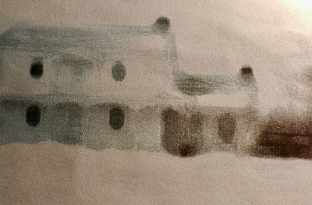 Illustration : stormy day in St-Antoine-sur-Richelieu, Québec circa 1995 – and still, we can see the contours of the house which is already something.