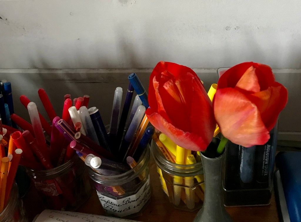 Dehors, les arbres s’agitent, secoués depuis deux jours par un vent comme une bourrasque permanente. Sur ma table de travail, deux tulipes réchappées des assauts. Dans le cahier des poèmes que je conserve, je recopie celui d’André Markowicz, publié dans la chronique du 19 mars, “Face au désastre”.