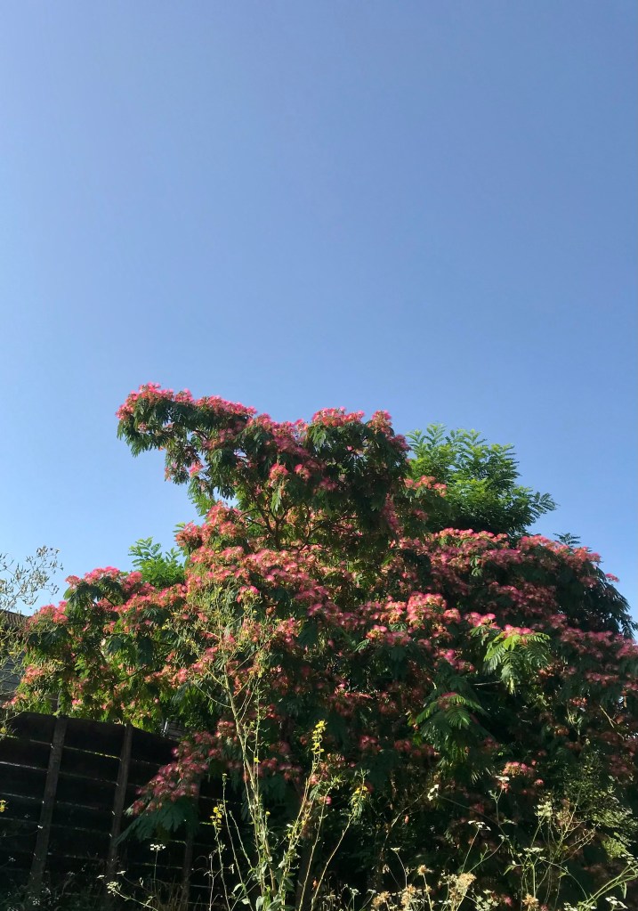 (La photo, prise hier de l’albizia en fleurs derrière chez moi, parce que, franchement, la beauté, juste là à s’en crever les yeux, pendant que les humains déconnent comme les derniers des dinosaures… Dernier bout d’infos lu hier soir : le message obséquieux du dirigeant de l’OTAN à l’endroit du président américain. Plus les élus représentent la fine fleur de l’imbécilité humaine, plus la veulerie à leur endroit se répand devant eux comme un tapis, assez pour nous y noyer tous. Ça se tortille avec toute l’énergie d’un unicellulaire dans une goutte d’eau. Salut à Toi, Roi des Idiots, ne lâche pas tes voyous contre moi !)