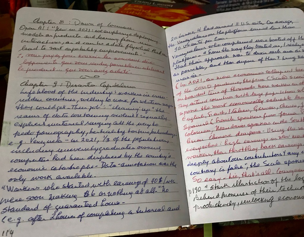 Open window. The air is more breathable, for the time being. I leaf through my notes about Karen Hao’s Empire of AI. Chapter 9 is titled Disaster Capitalism. “Lifeblood of the industry: workers in crisis-ridden countries, willing to work for whatever they could get. Their job: “cleaning up” the reams of data containing violent and sexually explicit material before they are “fed” to the microchips simulating human human communications. The services of the real humans discontinued when no longer needed, sometimes with final payments not even being provided. Domination did you say? Empire ? Really ?