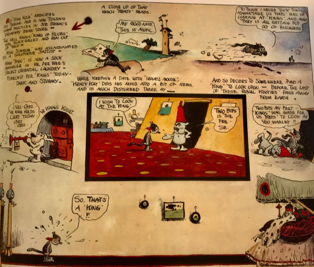 Illustration: “Krazy Kat” was the work of George Herriman who, from 1913 until his death in 1944 drew the indescribable adventures of a female cat (who might have been a male), crazy in love with Ignaz Mouse, a married mouse father of a large family who constantly threw a brick at the Kat, which the latter took to be a token of his love. In this episode, the “king” will turn out to be none other than Ignaz who will pull his usual trick on the Kat.