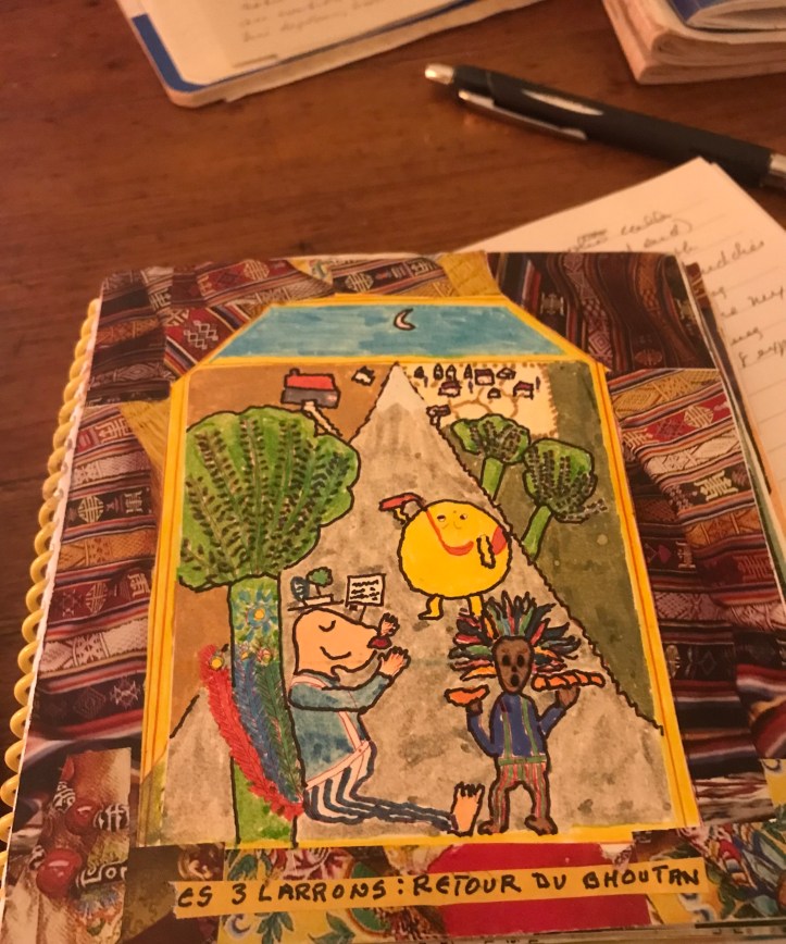 While in the tales making up L’Horloger des Brumes, young Sophie in 1974 worries over perhaps being tool old already, approaching 25, to find a husband and have her ideal family of three children. While the walls of labradorite are about to completely modify her personal history. (Today’s illustration is the cover of her “holiday notebook” of that summer.)