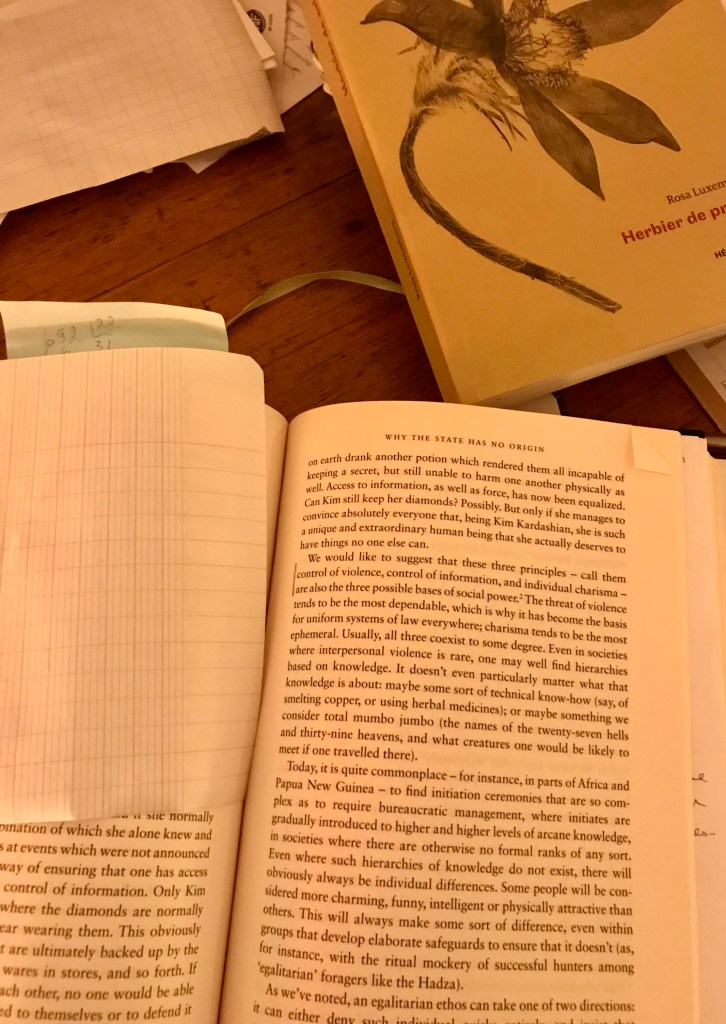 En fait, ce à quoi je veux réfléchir ce matin (autre qu’à la visite au labo qui aura lieu parce que la personne qui devait m’y conduire hier avait oublié), c’est la section intitulée Pourquoi l’Etat n’as pas d’Origine dans Au commencement était…une nouvelle histoire de l’humanité dans laquelle les auteurs suggèrent que la base du pouvoir social repose sur trois principes – le contrôle de la violence, le contrôle de l’information et le charisme individuel. Ce qui semble une évidence, mais peut s’exprimer de multiples façons, dont toutes ne requièrent pas le Règne d’Imbéciles Lourdement Armés.