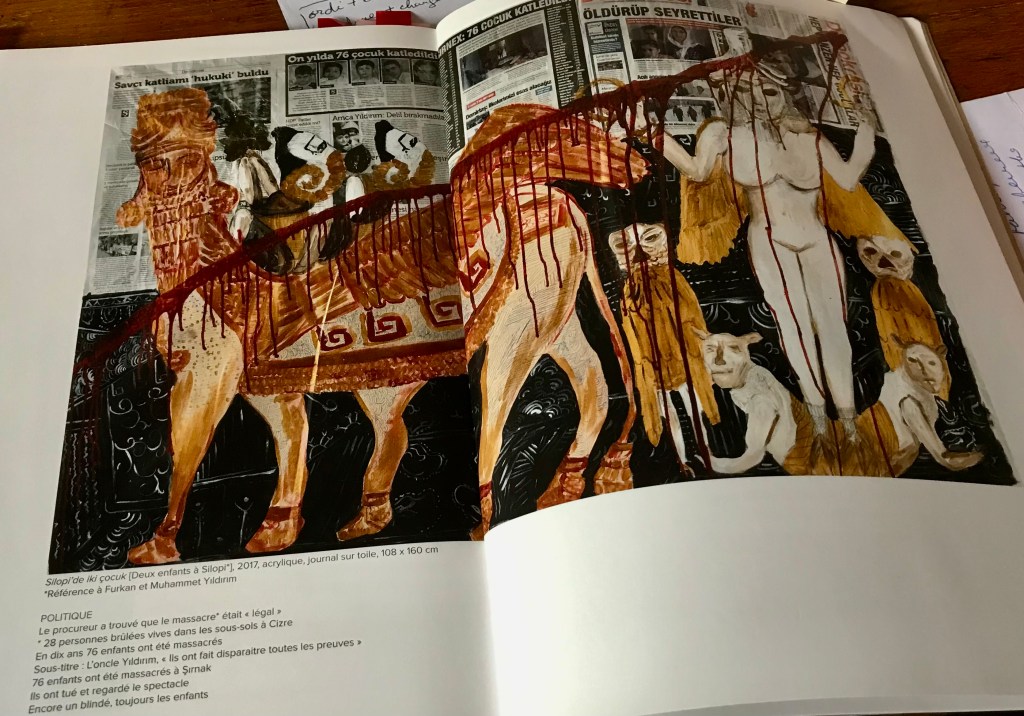 *La “référence à Furkan et Muhammed Yildrin” de Zehra Dogan est à deux jeunes frères kurdes,Furkan, 6 ans et Muhammed 7 ans, qui furent écrasés dans leur sommeil par un blindé de la police turque plongeant dans leur maison à Silopi, dans le sud-est de la Turquie. Les policiers ont fui sans autoriser le transfert des enfants à l’hôpital, et après avoir menacé la mère qui hurlait. La famille a dû se débrouiller seule pour s’y rendre, mais les enfants étaient déjà morts. Le préfet a qualifié le tout comme étant la volonté du “destin”. En 2017, Zehra Dogan a paint une série de tableaux sur fond d’articles de journaux turcs signalant d’autres “accidents dûs à la volonté du destin”.