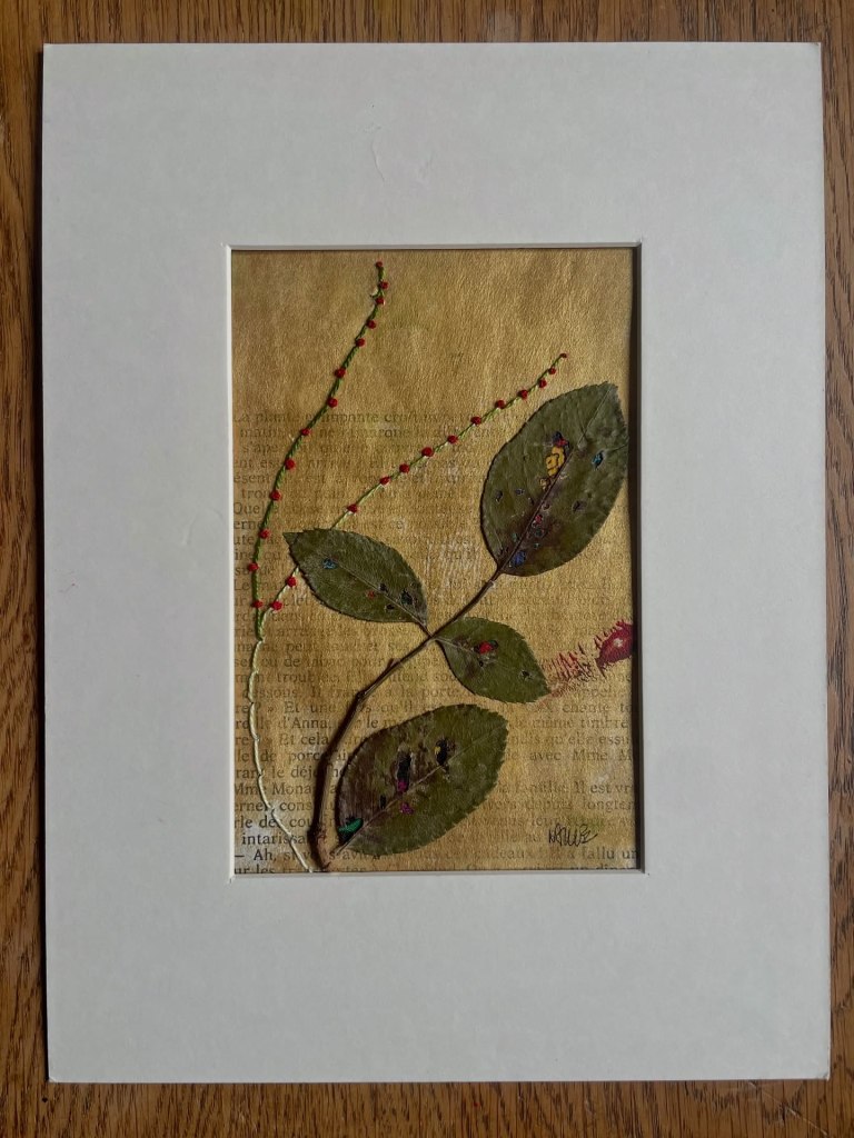 (composition vieux papier, feuilles, broderie par mon amie Naz Oke, Adopt-Art)