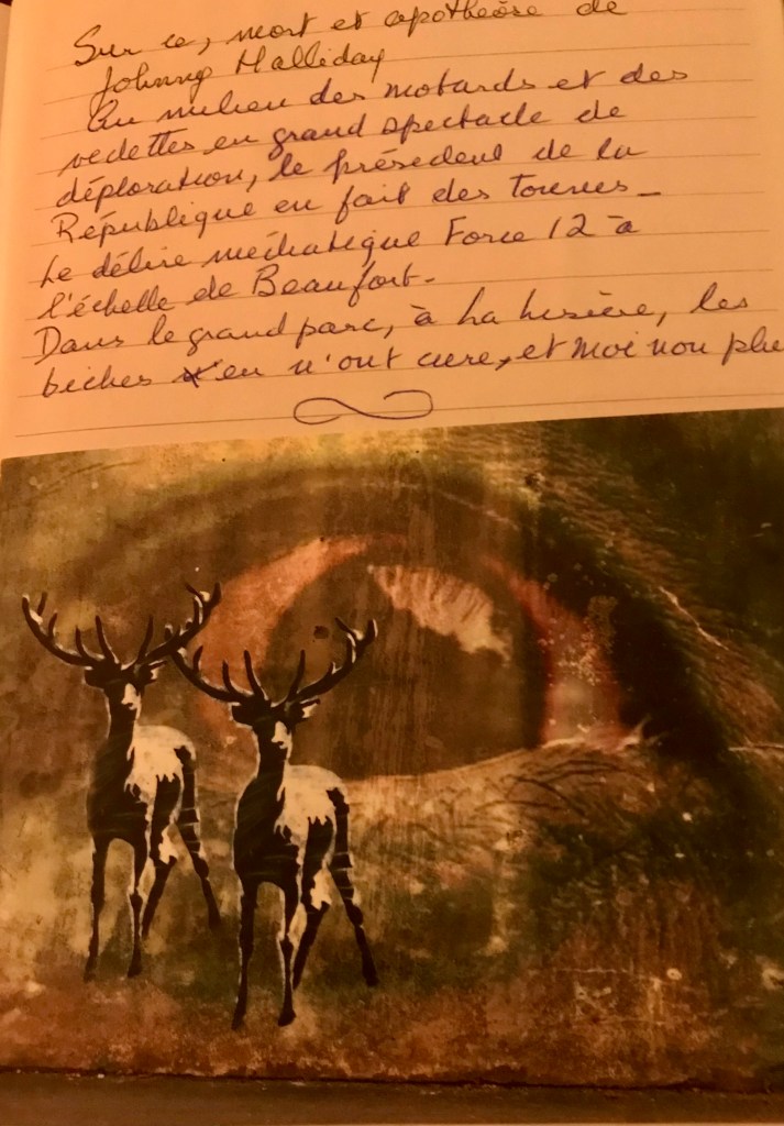 Yes, in December 2017, a buddy had obtained a residence period at La Lisière, for herself and two others, myself included. Jotted down in the notebook In No Chronological Order. The park itself served as residence to a pack of deer with uncanny acuity of hearing. The minute I stepped out of the residence for a walk in the forest, I would see them off in the distance, freeze then flee. But the image has turned into the dream the Engineer of the hillocks has the night before the arrival fo the two kids from the Valley of the Fogs.