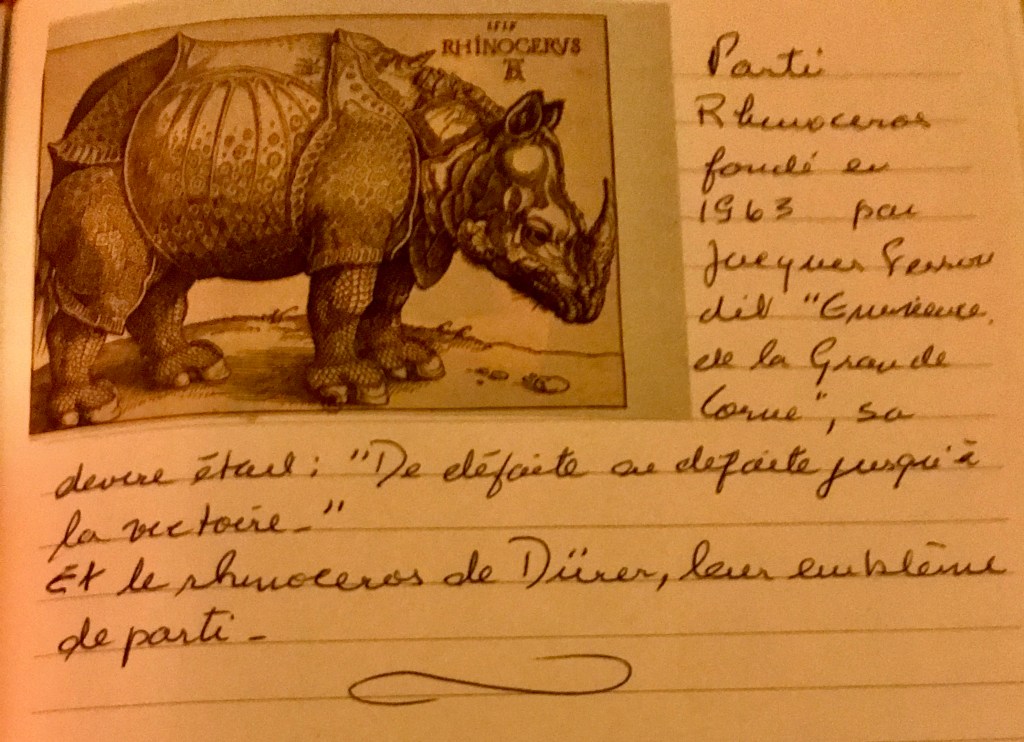 Personally, last night, I was leafing through the notebook titled “In no chronological order”, where I came across what I was using as an illustration today. Beyond the intentional irony of the founder of the party, Jacque Ferron, (who was referred to as “The Eminence of the Great Horn” and the party’s slogan was “Onward to victory, defeat after defeat“), the image of a rhinoceros encased in its protective plates is a pretty good illustration of the notion of democracies said to be representative, once said elected representatives no longer represent any other interests than those of their benefactors. As for the last white rhino of the North, male, he died in Kenya, leaving two females still alive, and a supply of sperm some hope to draw descendants from.