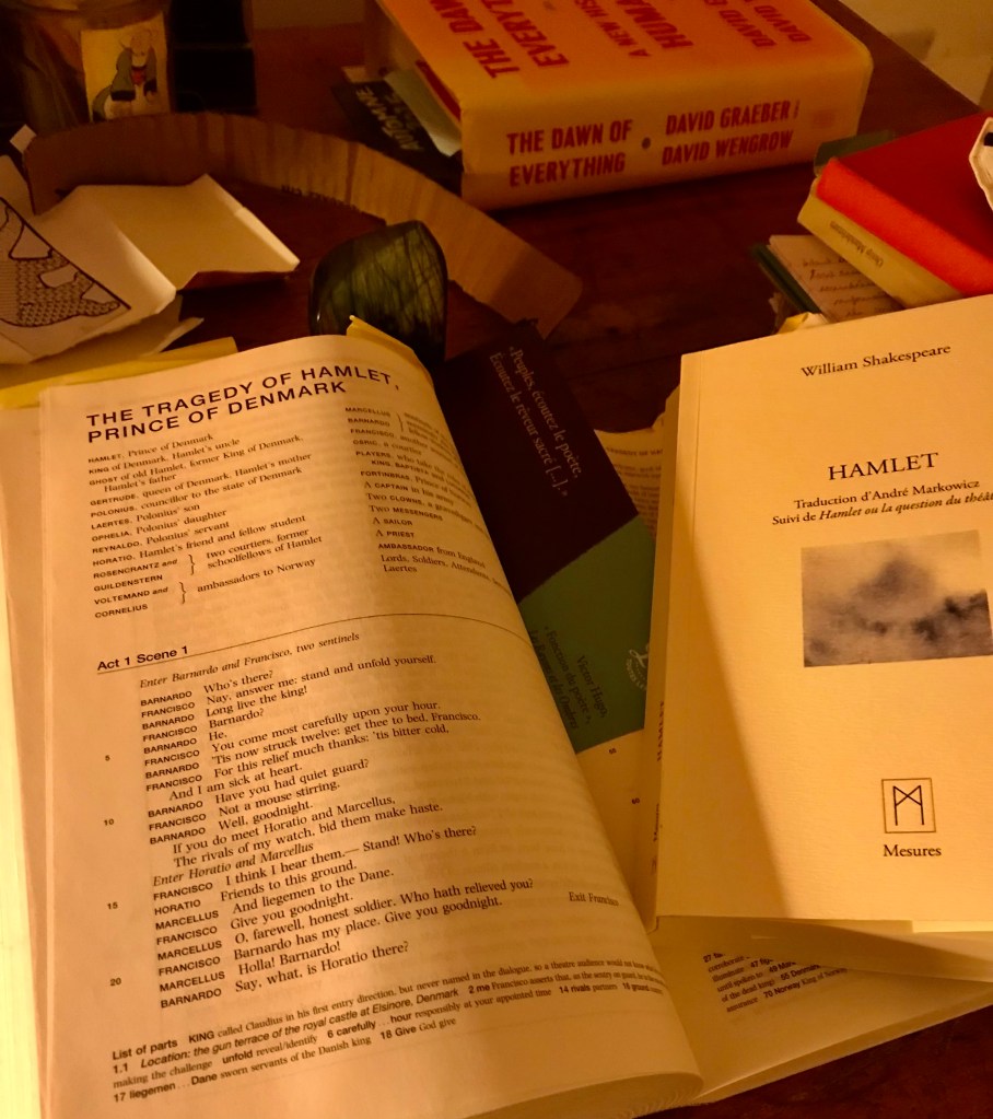 These reflections, following on the impassioned reading of Hamlet ou la question du théatre (Hamlet or the matter of theater) by André Markowicz, accompanying his French translation of Hamlet, a play I thought I knew, only to discover it here, metamorphosing before my eyes. Yes, I set everything aside to rush into its reading yesterday, upon receiving the parcel form Editions Mesures, for a veritable master class in translation, home delivered. Penniless, and how, but that’s nothing, truly nothing. Peter Brooke was right when he said to André Markowicz that the most important reply in Hamlet was “The readiness is all“.
