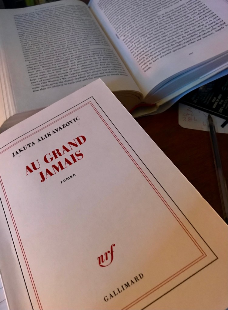 Beaucoup dormi. Et commencé la lecture du livre que m’a offert la soeur de mon amie, à Aurillac : Au Grand Jamais par Jakuta Alikavazovic. Dans lequel il est question de femmes disparues, de la mort d’une mère et de l’hommage que lui rend sa fille dans ce livre. Je ne sais pas si mon amie avait mentionné ou pas à sa soeur quelque chose au sujet de la grande absente dans ma vie; chose certaine, Alikavazovic écrit bien, je suis d’accord avec elle lorsqu’elle écrit : “On grandit autant dans un pays, dans un foyer, que dans certaines histoires.”
