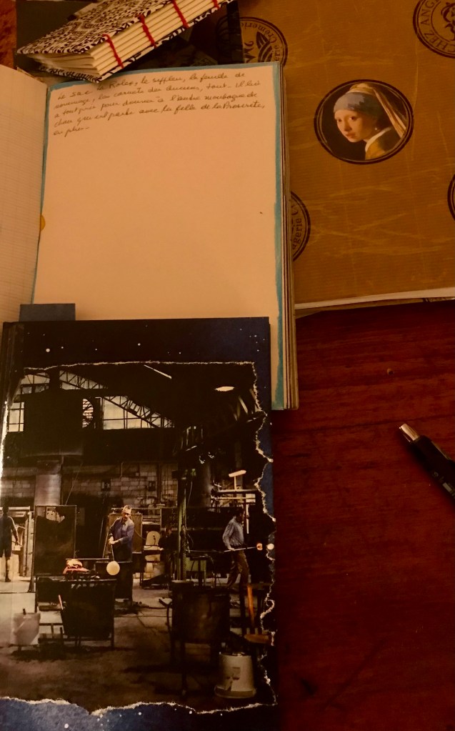 During this session of the workshop, last Monday, the group leader notblay distributed the lines from French popular songs to which you were to add three lines of text without thinking too much about it. On the great bellowing of “Capri, all is ended” I added “ans I’m laughing as I say goodbye forever, stay in Capri, I prefer Arezzo”. On “And if you didn’t exist…” You know what ? I’d exist anyway, I swear, especially since I already existed also before meeting you.” (In the notebook with Vermeer’s Girl with a Pearl, looking back on us. The dreams are in the blue notebook with men blowing glass on the cover, the open one is L’Horloger des Brumes) and the small one with the coptic binding was made by the workshop team leader.