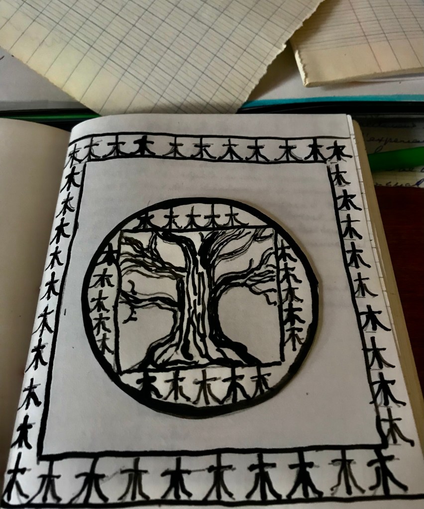Pour l’arbre dans le carnet, j’ai choisi une combinaison de l’arbre que dessine Alechinsky et de celui dessiné par ma fille dont le prénom en hébreu signifie arbre, (dessin qu’elle a reproduit sur un mug).