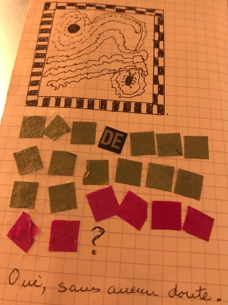 The last of the dreams, directly inspired by a brief incident yesterday: As they approached the Tir’Chaille following Rustine and Valentina’s marriage at City Hall, the crowd of her Chilean buddies from Toulouse stopped in front of one of the very ancient buildings in ruins on my street for a group photo in front of a rusted metal shutter covered with graffiti. At the very top of this shutter one finds the name of Antony, the young de-scolarized Rom I once was missioned to teach some reading, some writing…without too much success A kid I “immortalized” in my own fashion in a story called Une poule avertie en vaut deux (which can translate as Once Bitten Twice Shy). The real Antony is now part of one of the families active in the town of Perpignan, further South. On the rest of that rusted shutter appear the names and the hearts pierced with an arrow registering the loves and temporary crushes of other kids from the neighborhood. (The illustration : from some of the confetti pulled out of my hair and the recollection of another Rom I was missioned to teach the reading skills required to learn the driving code so he would stop driving without a license. He had been de-scolarized at age 7, and only remembered the letters in his name and in the word “police”.)