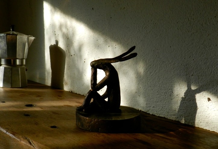 The boxes clearly being related to the project of the presentation for the tales in L’Horloger des Brumes. Someone — in this odd mode of “communication”, one never knows the identity of the “someone” unless he or she leaves a comment — consulted a column from September 20th 2024 that I had illustrated with the “thinking hare” I would have gladly acquired had it not already been reserved by someone else. In copying it, the words”…and miles to go before I sleep” come to mind. ,